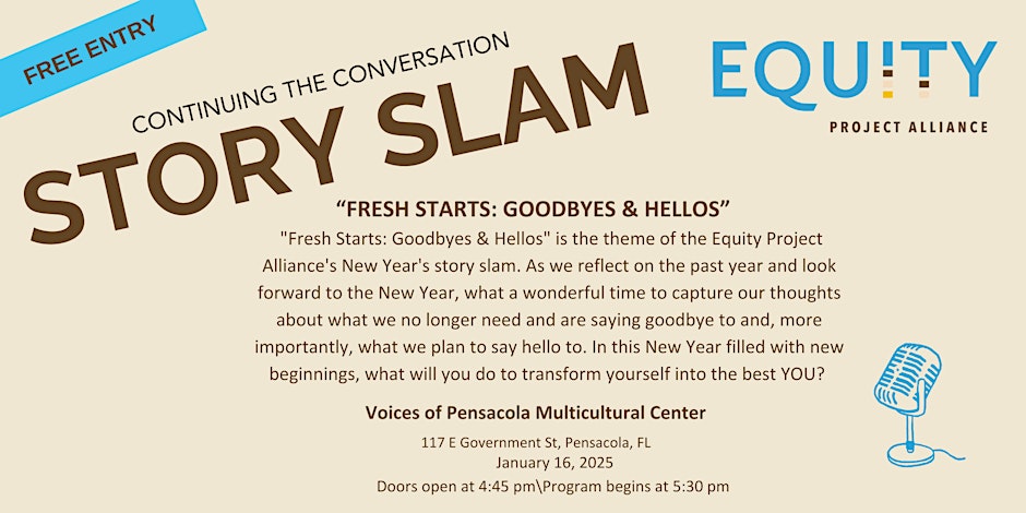 “Fresh Starts: Goodbyes & Hellos” is the theme of the Equity Project Alliance’s New Year’s story slam. As we reflect on the past year and look forward to the New Year, what a wonderful time to capture our thoughts about what we are saying goodbye to and, more importantly, what we plan to say hello to in the New Year. A fresh start gives us the opportunity to start something new and to let go of something that no longer fits – both figuratively and literally. What is something that you are looking forward to doing or becoming in the New Year? What is something that you want to let go of? If you’re not sure what this might be, just ask a good friend.